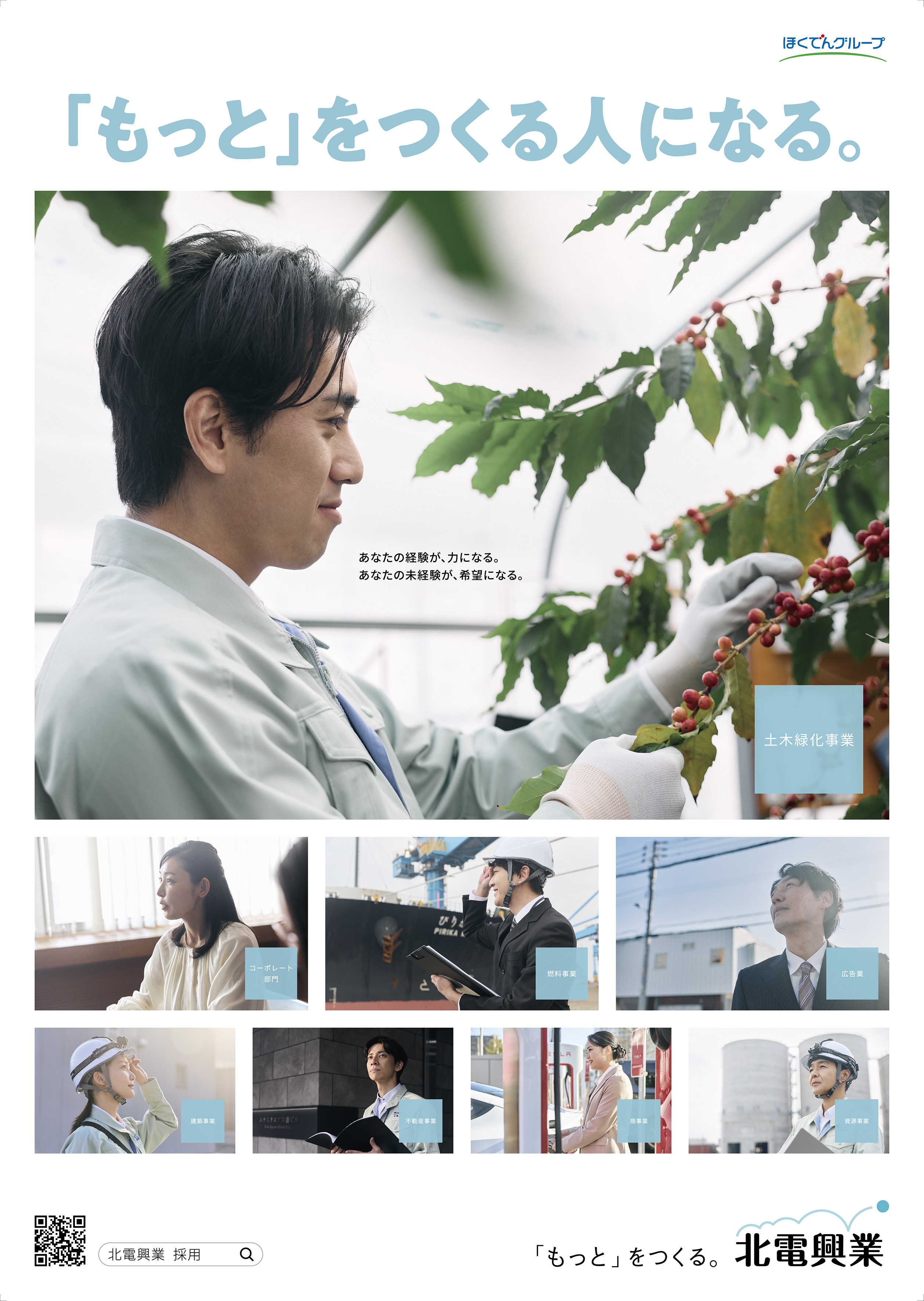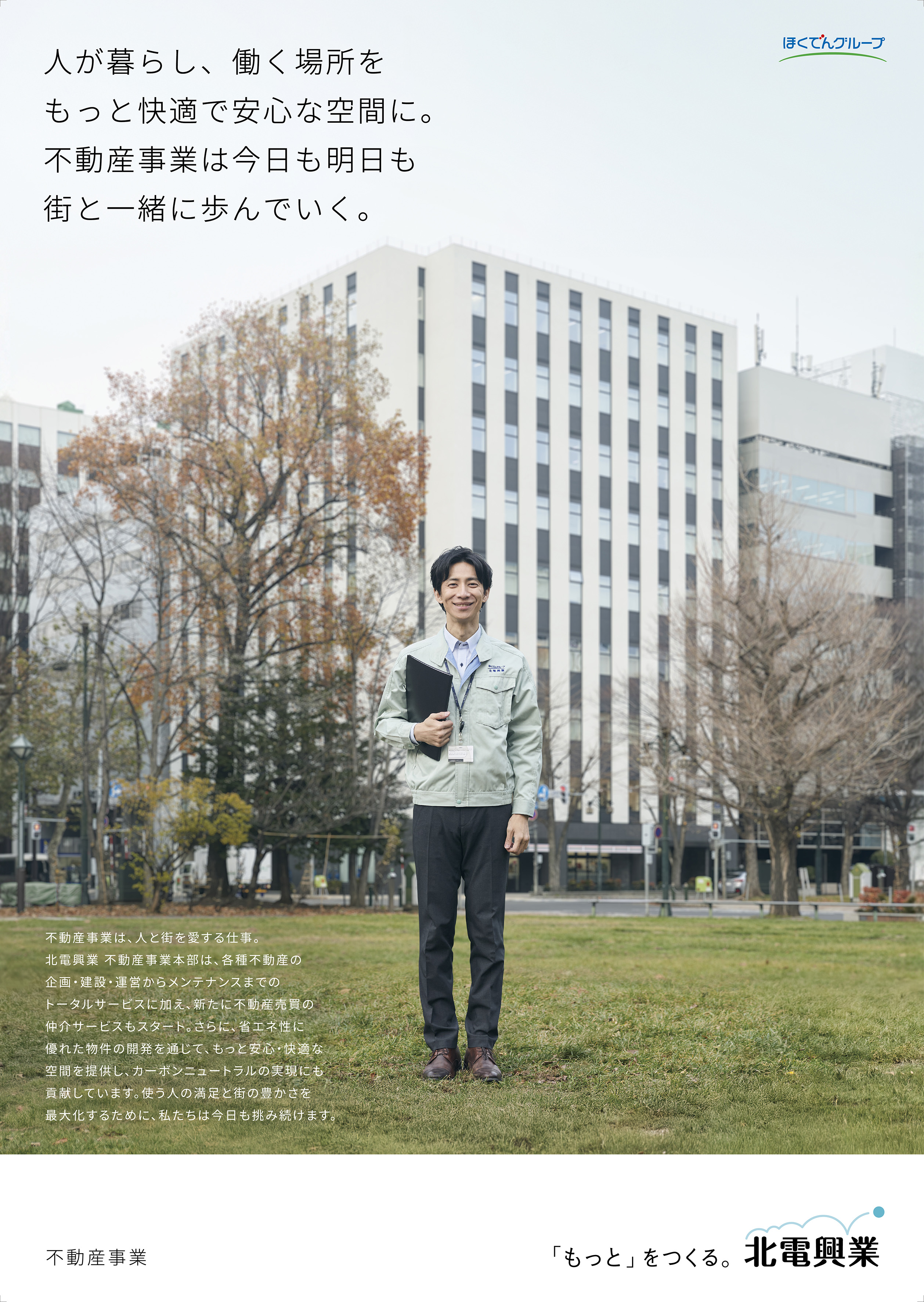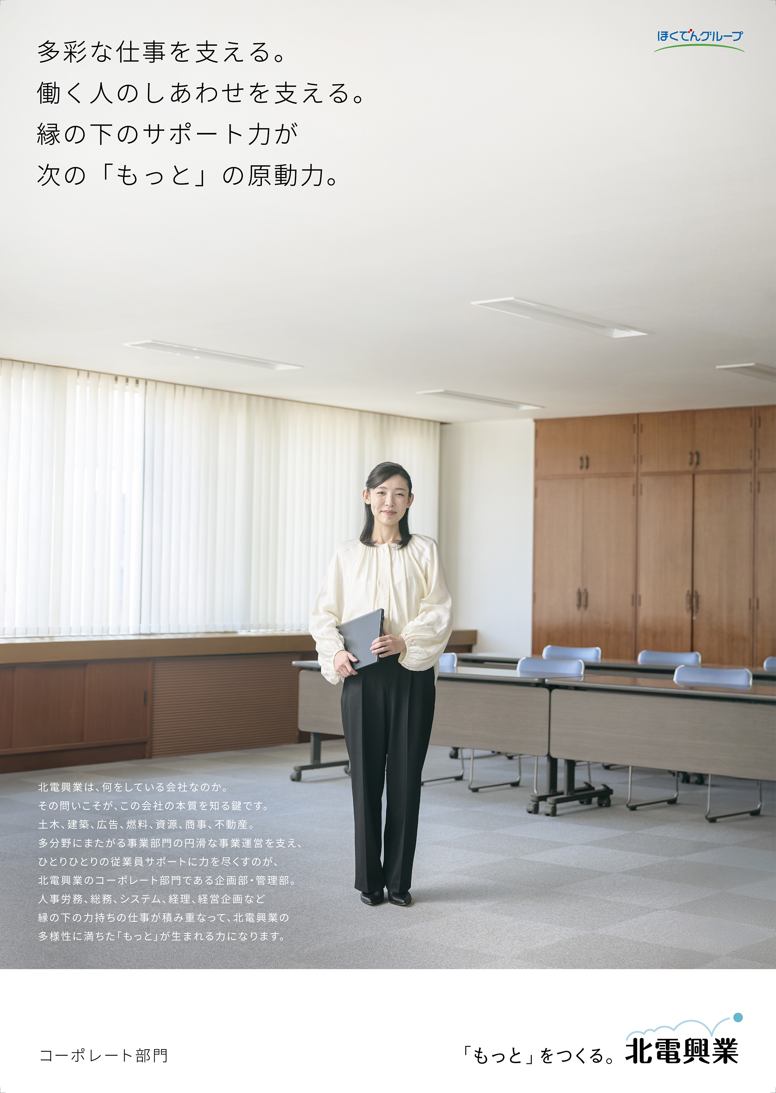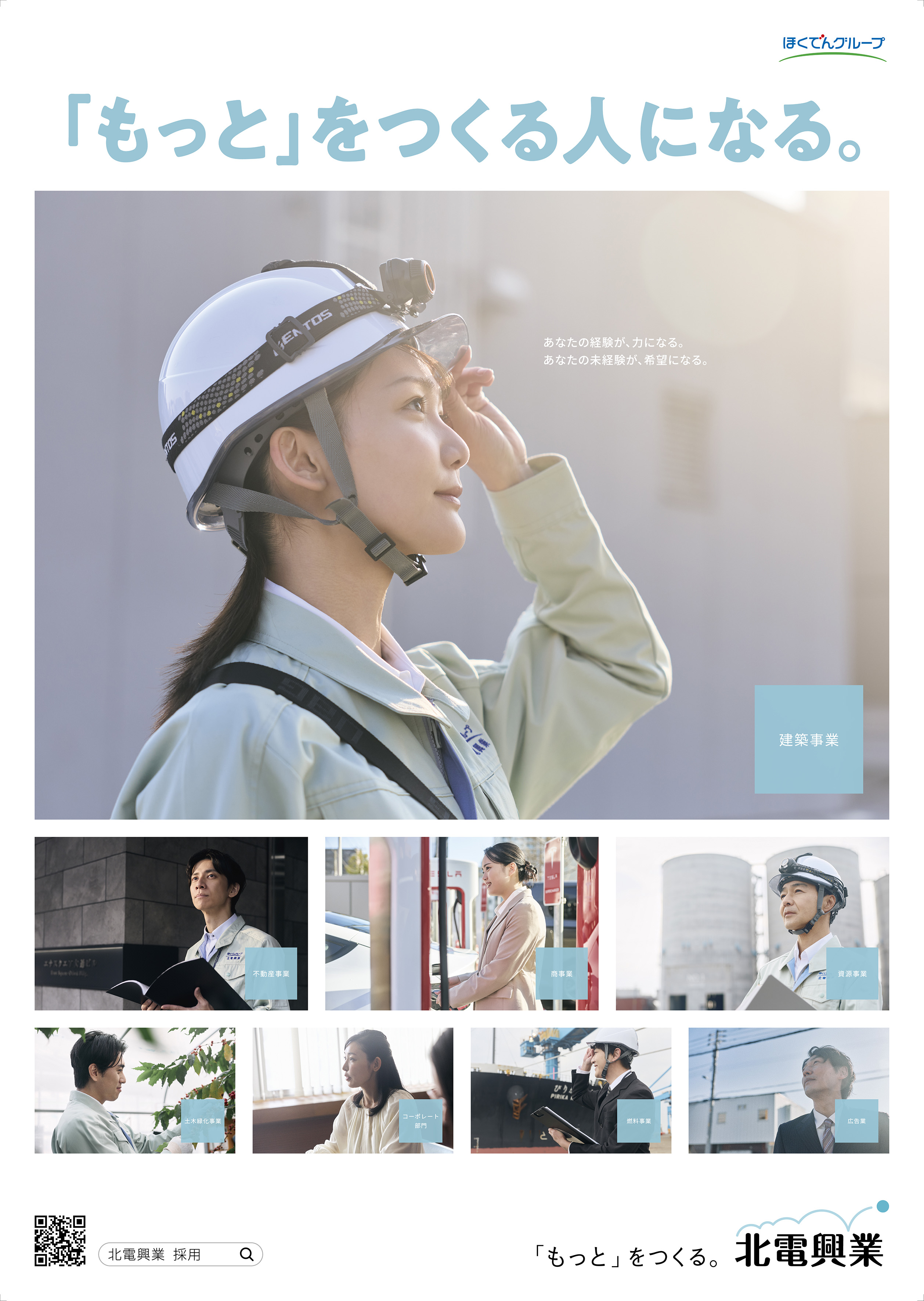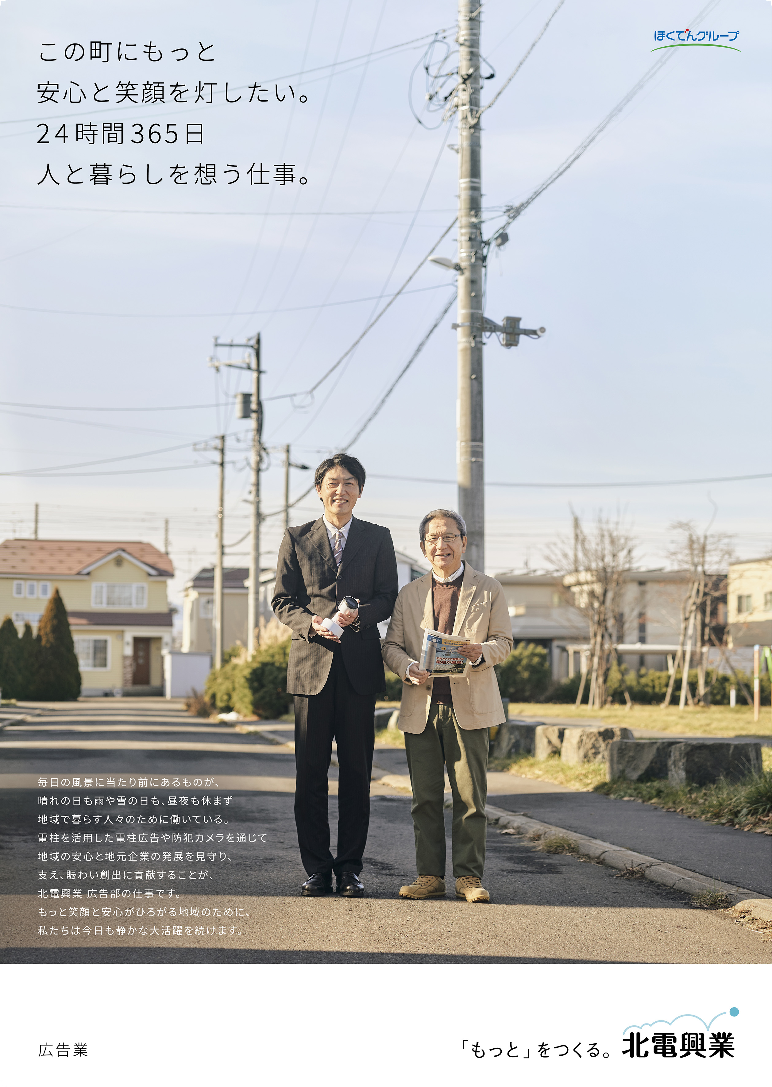 古川さん: 採用広告のコピーについても、“「もっと」をつくる人になる。”という言葉を掲げ、北電興業様の姿勢が採用まで一気通貫したメッセージになるよう工夫しました。ポスターの文面のバランスも、街を俯瞰して見ている視点から細かい仕事の内容に入っていくようなストーリーを感じさせるものになっています。