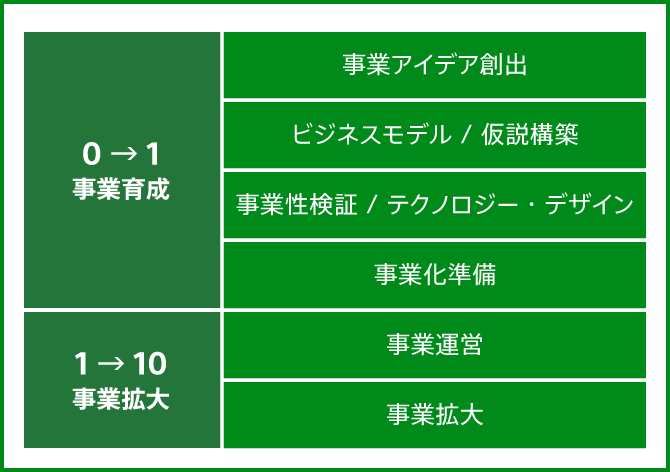 「事業アイデア創出」「ビジネスモデル仮説構築」「事業性検証・テクノロジー・デザイン」「事業化準備」「事業運営」「事業拡大」の6つのフェーズのどこからでも支援いたします。また複数の支援項目を組み合わせたパッケージでのご利用も可能です。