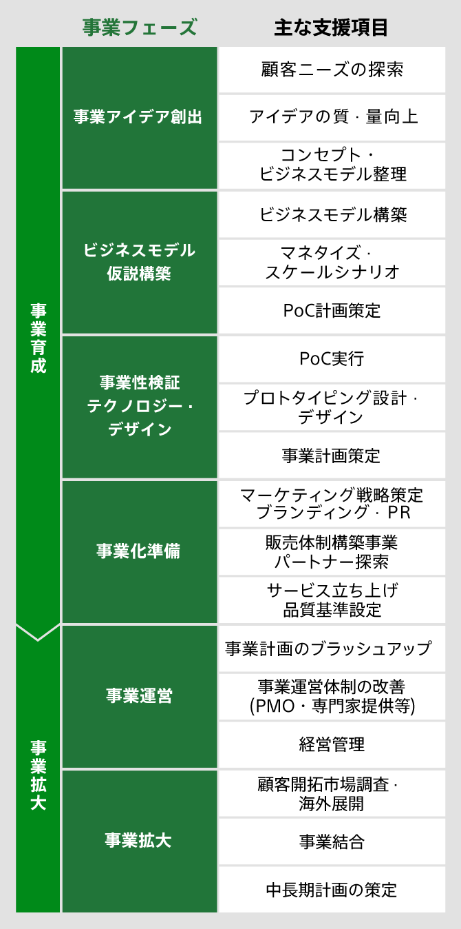 「事業アイデア創出」「ビジネスモデル仮説構築」「事業性検証・テクノロジー・デザイン」「事業化準備」「事業運営」「事業拡大」の6つのフェーズのどこからでも支援いたします。また複数の支援項目を組み合わせたパッケージでのご利用も可能です。