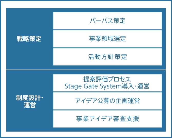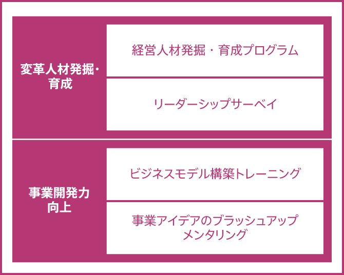 新規事業・事業開発を推進する組織の開発においては、戦略策定や制度設計・運営の支援を、人材の開発においては変革人材の発掘や育成、事業開発力向上を支援します。