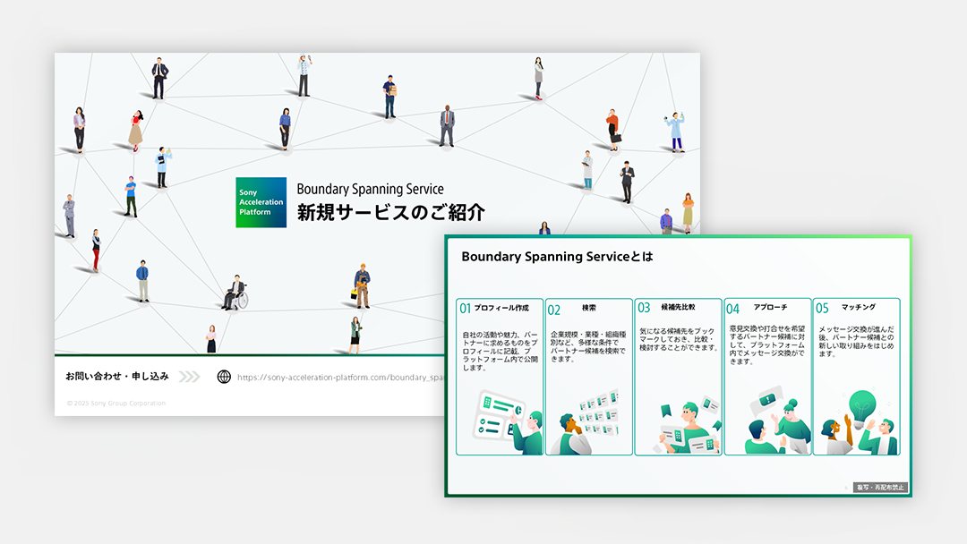 Sony Acceleration Platformが提供するビジネスマッチングサービスのご紹介資料です。多様なアイデア、ノウハウ、技術をもつ企業の中から、最適なパートナーを探すことができます。